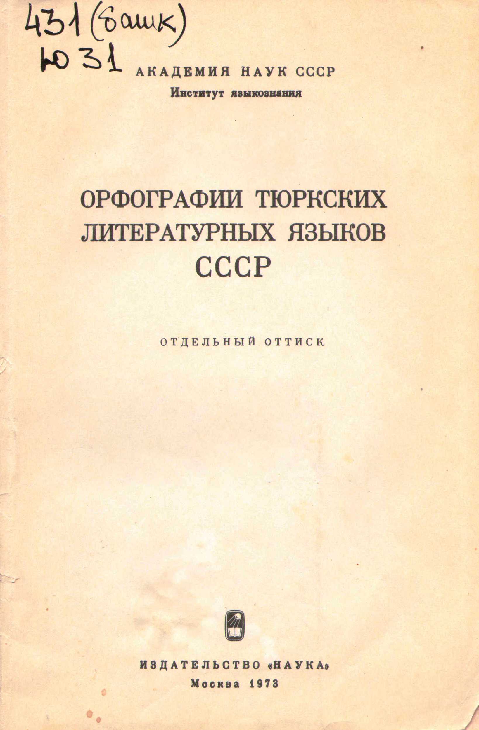 ![]() | Б-102567 431 (башк) Ю 31 (отд. оттиск) Юлдашев, А.А. Орфография башкирского языка / А.А. Юлдашев // Орфографии тюркских литературных языков СССР / отв. ред. К.М. Мусаев. – Москва, 1973. – С.76-90.