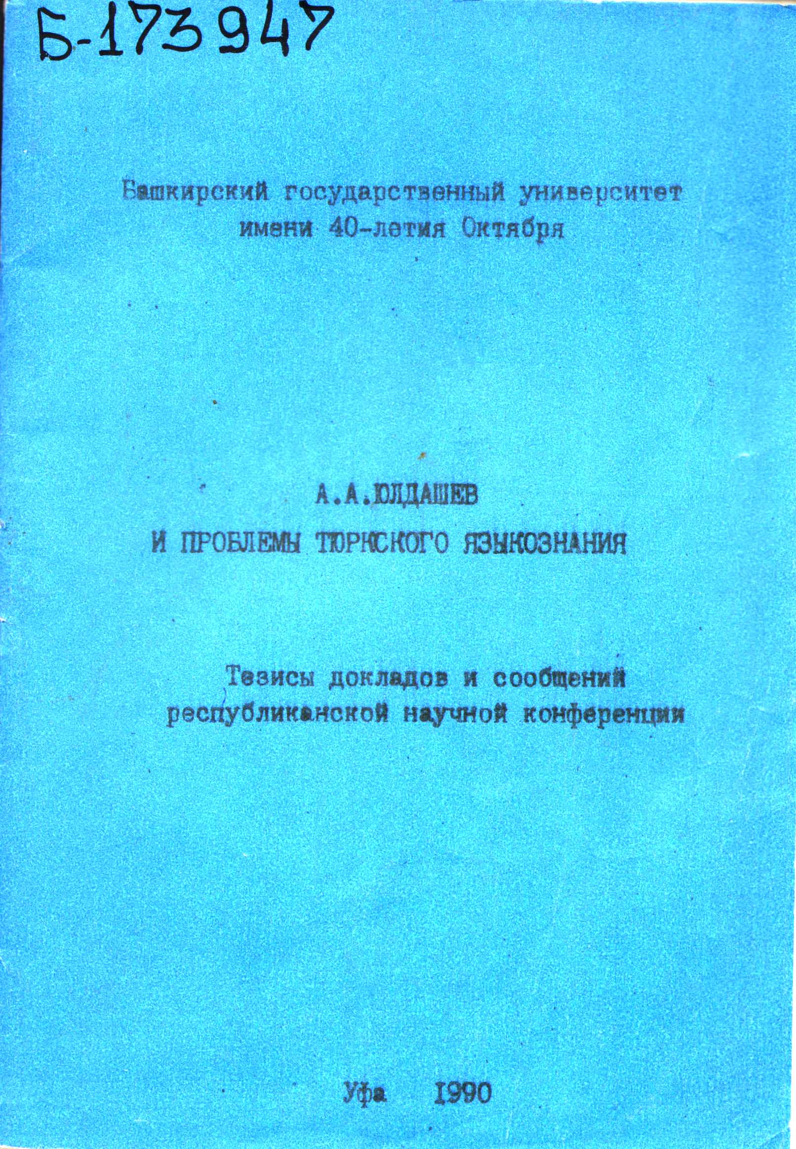 ![]() | Б-173947 А.А. Юлдашев и проблемы тюркского языкознания : тезисы докл. и сообщ. республик. науч. конф. / редкол.: М.В. Зайнуллин (отв. ред.), Т.А. Кильдибекова, З.Г. Ураксин. – Уфа : [б.и.], 1990. – 42 с. Содерж.: Гарипов, Т.М. Ахнеф Юлдашев – тюрколог новой формации / Т.М. Гарипов. – С.6-7. Ураксин, З.Г. Разработка А.А. Юлдашевым теоретических проблем тюркской двуязычной лексикографии / З.Г. Ураксин. – С.7-8. Миржанова, С.Ф. А.А. Юлдашев и проблемы башкирской диалектологии / С.Ф. Миржанова. – С.8-10. Хисамитдинова, Ф.Г. А.А. Юлдашев и проблема реконструкции первоначальных черт языка северо-западных башкир / Ф.Г. Хисамитдинова. – С.10-11.