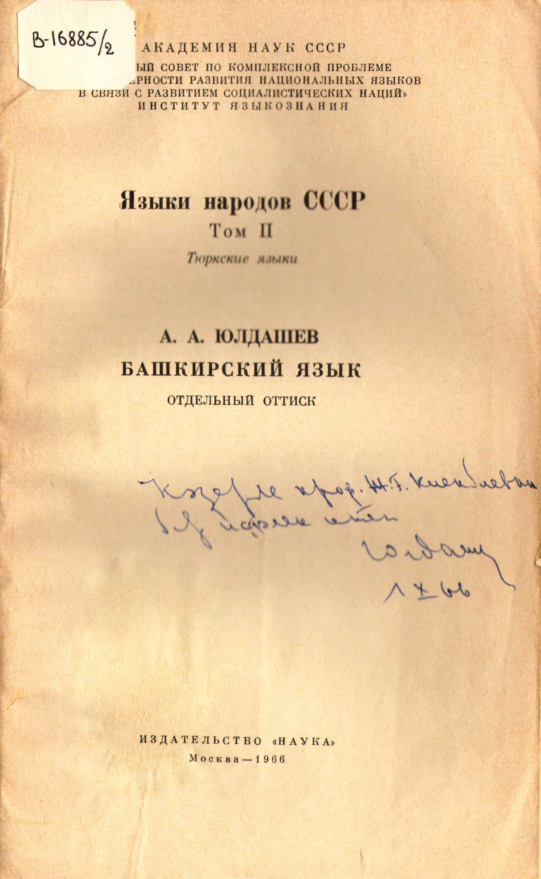 ![]() | В-20436 т.2 В-16885 (отд. оттиск) Юлдашев, А.А. Башкирский язык / А.А. Юлдашев // Языки народов СССР. Т.2 : Тюркские языки / [отв. ред. Н.А. Баскаков] – Москва : Наука, 1966. – С.173-193.